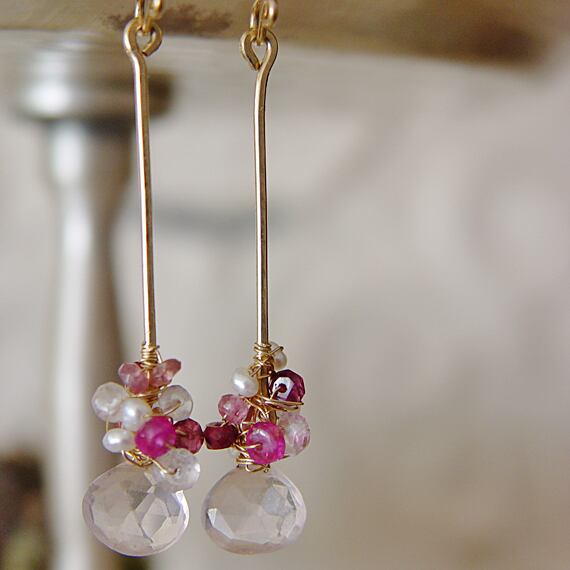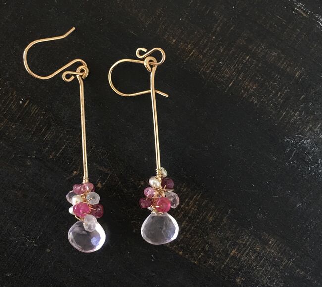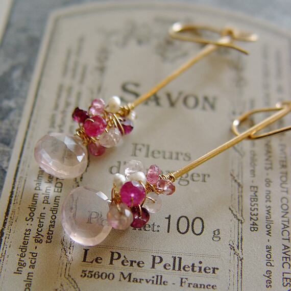 ぷっくりとしたやさしいピンク色のローズクォーツを、華やかなピンクの石たちと共に、ゴールドフィルのバーにワイヤーラッピングした個性的なロングピアスです。