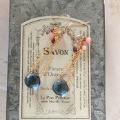 女性らしい柔らかなブルーが印象的なロンドンブルークォーツに、甘いローズカラーの天然石をブーケのように合わせたトライアングルピアスです。
