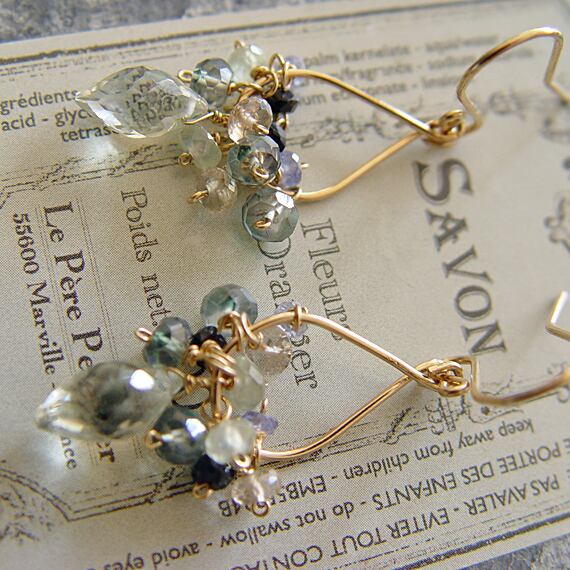 14kゴールドフィルを使用したフープは小ぶりながら重厚感があり、グリーン、ブルー、ブラック系の石をシックにまとめています。