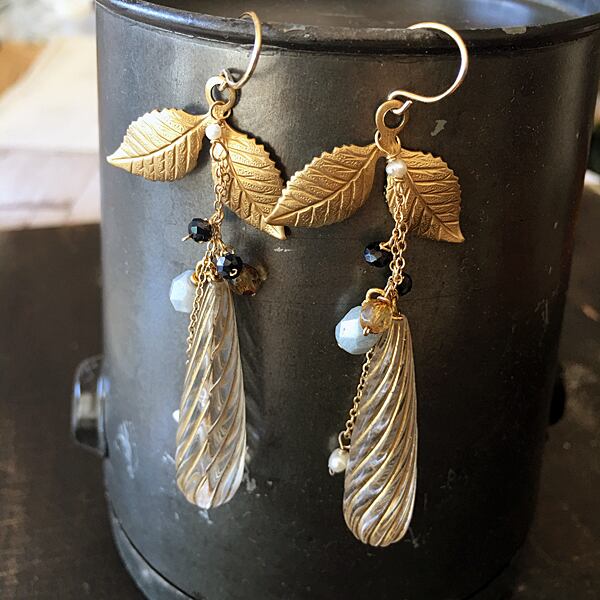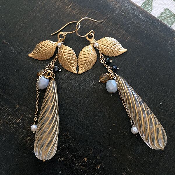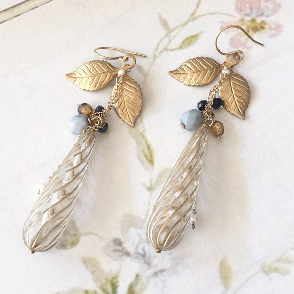 精巧な真鍮のリーフチャームから、アンティーク風のアクリルロングドロップを垂らした、フェミニンで印象的なピアスです。