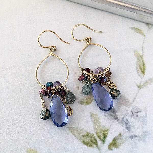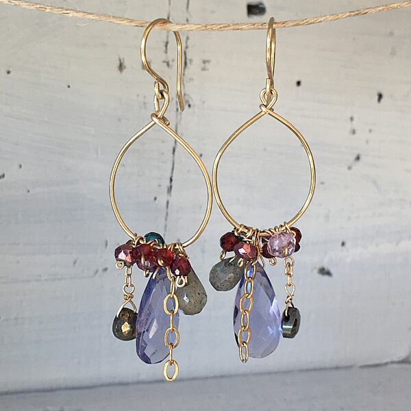 縦長のタンザナイトクォーツと、赤やブルーの天然石、落ち着いたラブラドライトとメタリックなパイライトを合わせ、ゴールドフィルドのチェーンのフリンジで華やかさを出したフープピアスです。