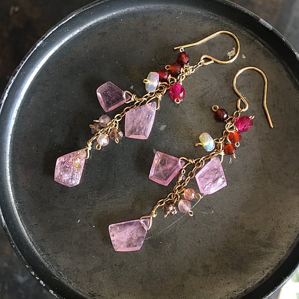 淡いピンクのルビーの甘い表情と相まったモダンなスライスタンブルカットがスタイリッシュ。遊色効果の美しいオパールと、シックなカラーチェンジガーネットが、大人っぽい艶やかさを演出してくれます。