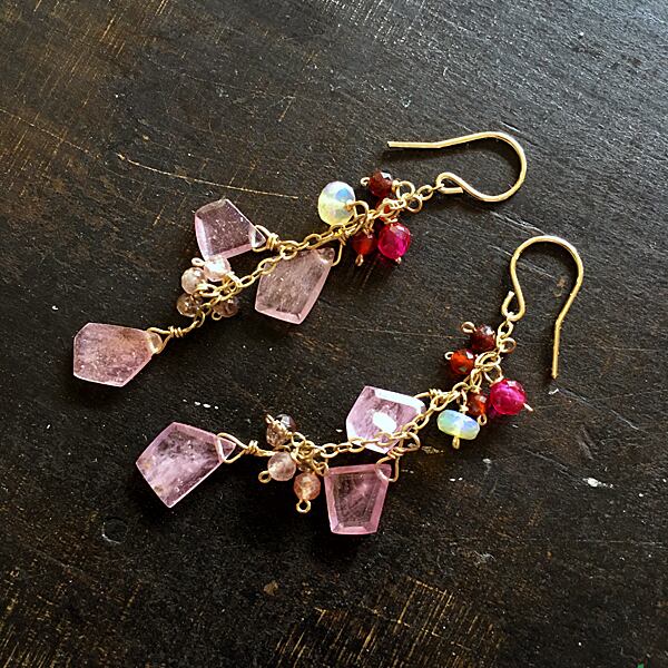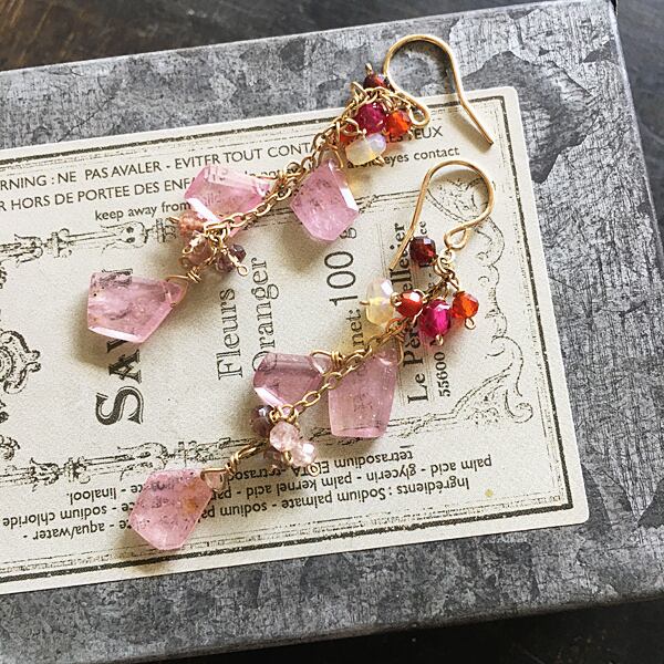 グラスフィールド加工されたつややかなルビーのスライスタンブルと、キラキラ光る赤い天然石を数種類合わせた、華やかで女性らしいロングピアスです。
