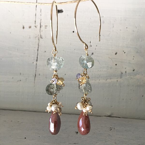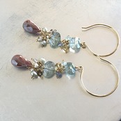 間にはキラキラ輝くビアクォーツ、タンザナイト、上品なグレイのケシパールなどをあしらい、華やかさも出してみました。季節を選ばずお使いいただけるピアスです。